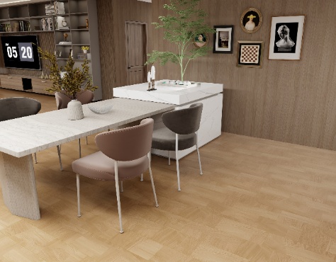 暖黃色調本身就給人溫暖、舒適之感,魚骨紋的排列則增添了一份靈動與活潑,兩者結合能讓空間充滿溫馨的家庭氛圍,使人感到放松和愉悅 ,增強空間層次感,魚骨紋的獨特拼接方式,使地板呈現(xiàn)出豐富的紋理和線條變化,與暖黃色調相配合,在光影的作用下,能增強空間的層次感和立體感。