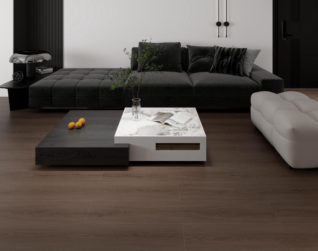 如陳年紅酒般的深褐色地板,自帶復(fù)古與奢華的厚重底蘊。其沉穩(wěn)色調(diào)與黃銅燈具、皮質(zhì)沙發(fā)相得益彰,輔以暗紅色絨毯的碰撞,既能承載古典風(fēng)格的儀式感,又能通過光影層次打造出戲劇化的空間張力,滿足對深度美學(xué)有執(zhí)念的品味者