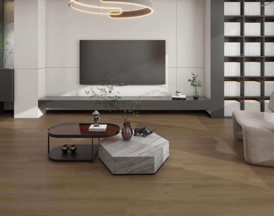 淺棕色地板,以烘焙中的麥芽糖與風化陶土共生的漸變層次為靈感,在空間界面拓印出物質(zhì)轉(zhuǎn)化的呼吸節(jié)律。其表面肌理凝結(jié)著沙漠巖層與麂皮絨面交織的悖論觸感——納米級分子沉積技術(shù)復(fù)刻出千年古木的皸裂紋,而動態(tài)熱壓工藝卻在0.2毫米的漸變層中凝固了蜂蜜滴落時的張力曲面。當智能光感系統(tǒng)捕捉到晨昏線位移時,色溫會沿晶格結(jié)構(gòu)析出焦糖脆殼破裂時的光譜漣漪,使陽極氧化鋁的科技冷感與手織羊毛的有機溫度,在千分之一秒內(nèi)完成從量子糾纏到和諧共振的認知躍遷。這種色調(diào)如同經(jīng)過慢發(fā)酵的美學催化劑,既中和了混凝土墻體的地質(zhì)剛性,又為碳纖維織物的未來感注入了可觸摸的原始記憶,讓空間蛻變?yōu)檫B接農(nóng)耕文明與量子計算的雙生載體。