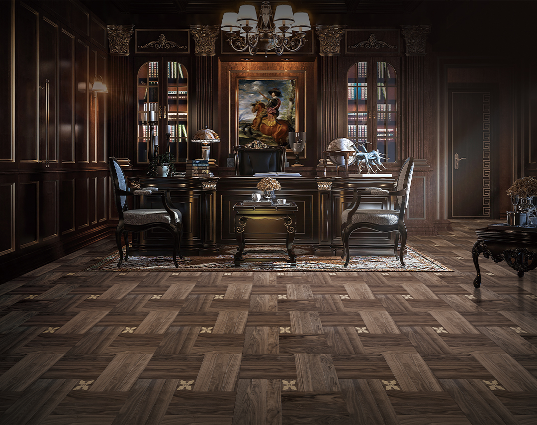 創(chuàng)意拼花設(shè)計(jì),交錯(cuò)富有美感,地板本身的胡桃木色宛如皇室城堡般的貴族氣質(zhì)、大氣典雅。