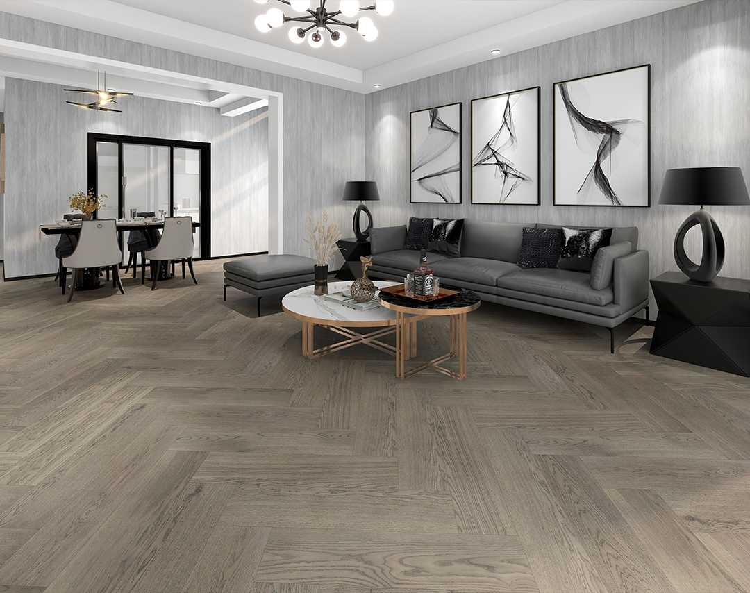 櫟木絢麗張揚(yáng)的紋理搭配富有靈動(dòng)跳躍感的人字拼,低調(diào)內(nèi)斂的灰咖色在縱橫的紋理間濃淡相宜,疏朗有致,充滿(mǎn)了打破束縛,縱情瀟灑的不羈之感,空間中彌漫出對(duì)自由生活的無(wú)限向往。
