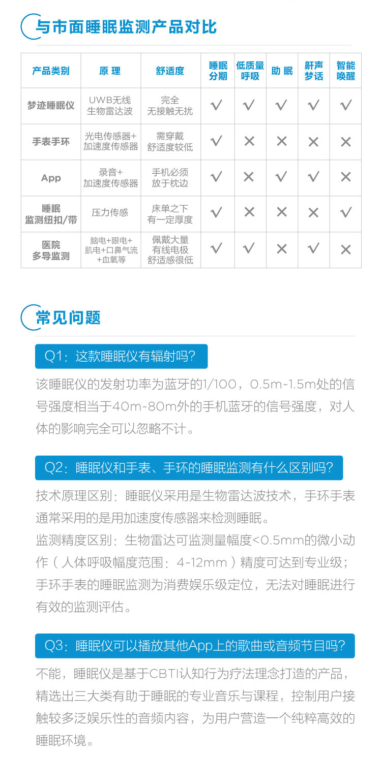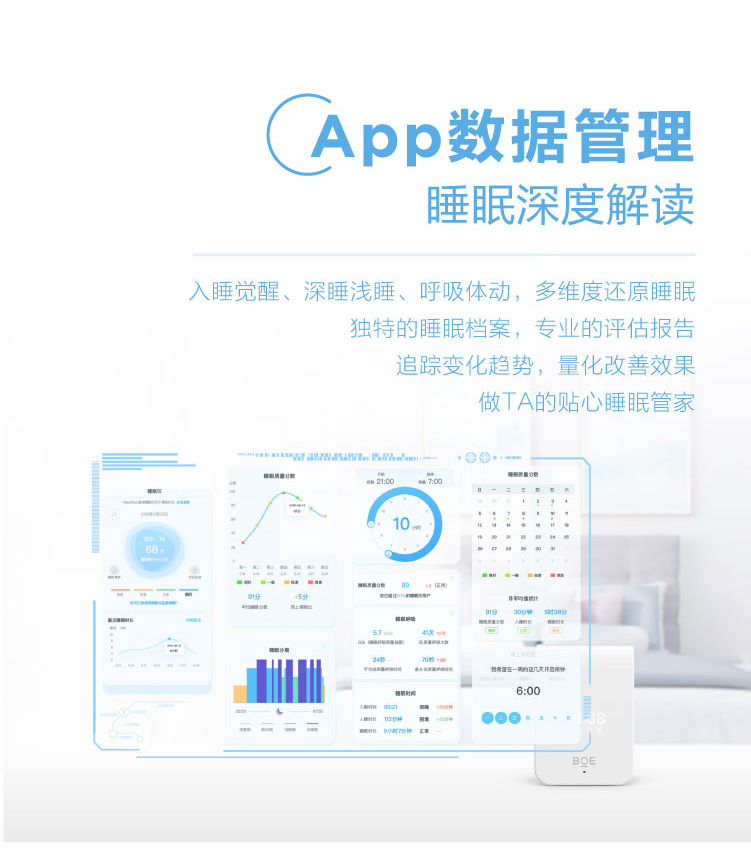 睡眠呼吸質量指數(RQI)、睡眠質量分數(SQI)、睡眠分期時長統計及比例、實時呼吸率、心率體動趨勢、鼾聲夢話