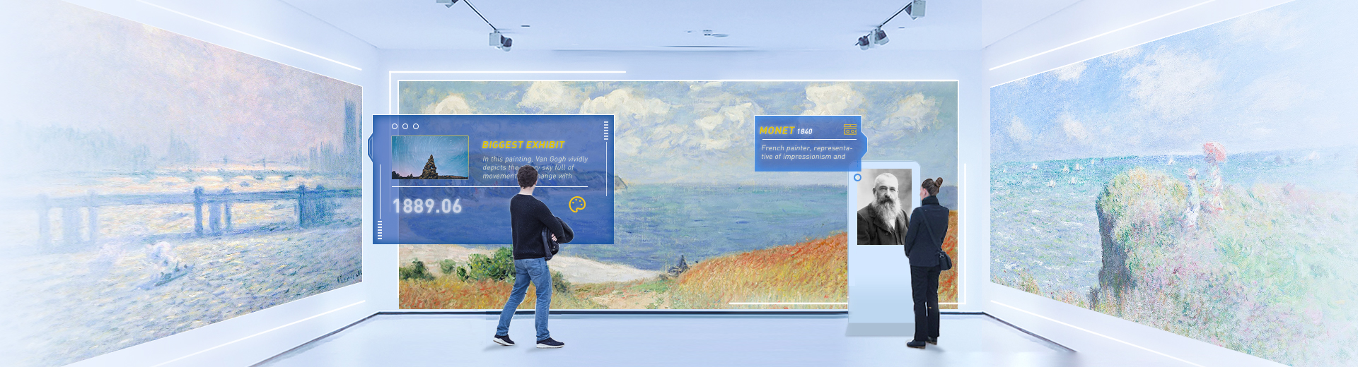 Circular cinerama fusionpProjection/u-shaped video wall (Immersive) BOE igallery video wall/historical evolution wall (corridor) Projection & rotating display interactive wall (experiential) 180 °/270 ° holographic projection on large curtain display (stage)